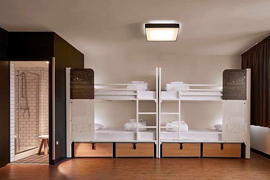 This room features 4 bunk beds that includes a personal light, personal shelf, charging station with USB port, and under-bed lockers. There is a private bathroom. Pillow, duvet, and linen are supplied.